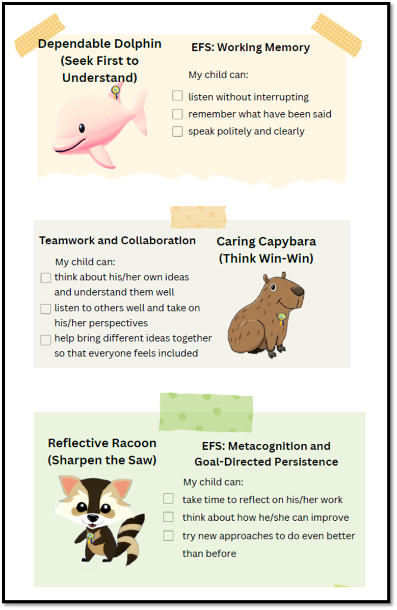 - Use the EFS mascots to highlight positive behaviours. For example: “You are always able to stay focused on completing your homework. Well done, On-Task Tiger!”